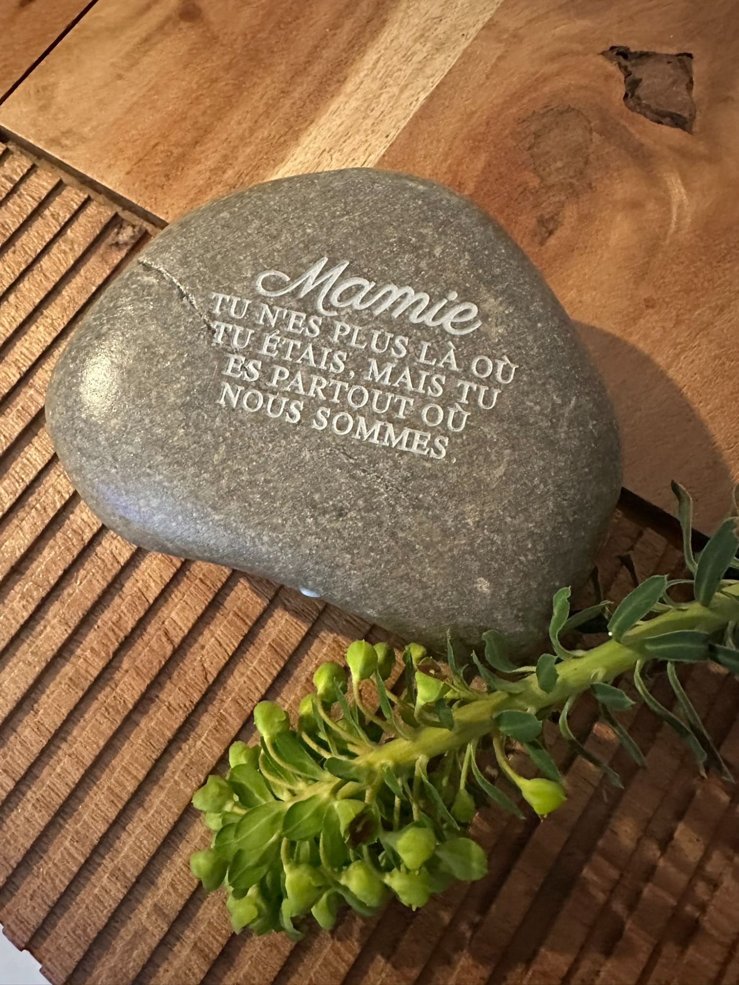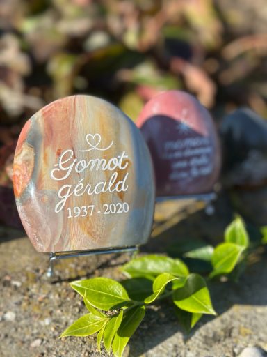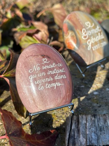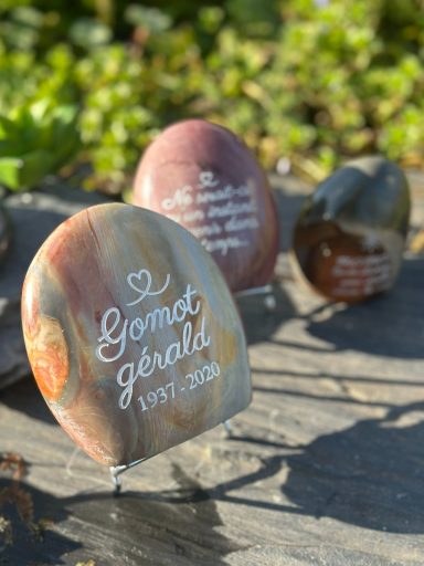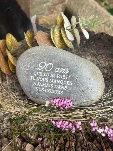 Vous y découvrirez des créations uniques et personnalisées, réalisées avec soin pour mes clients pour rendre hommage à leurs êtres chers. Chaque galet, chaque mot, chaque gravure porte une histoire, un lien, une émotion.